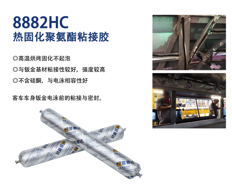 产品说明 韧驰8882HC热固化聚氨酯粘接胶是一种单组分热固化聚氨酯胶,加热后快速固化,具有良好的密封性能和内聚力,对被粘基材无腐蚀,无污染,对环境无污染,与金属、玻璃等多种基材粘接性较好。 主要用途 客车车身钣金电泳前的粘接与密封。
